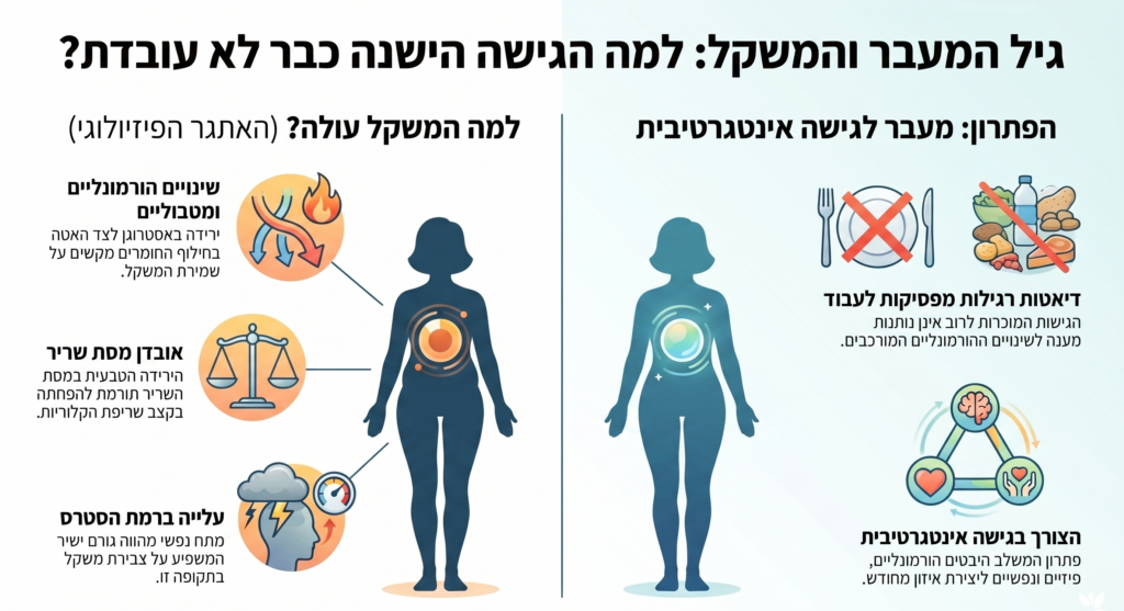 ירידה במשקל בגיל המעבר הופכת מאתגרת יותר בגלל שילוב של כמה גורמים: